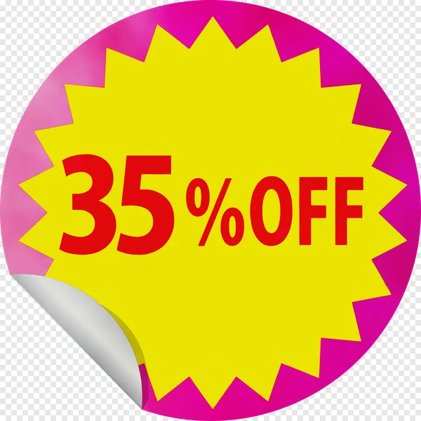 Grab this eye-catching 35% OFF discount sticker PNG for your next promotion! This vibrant graphic features bold red "35% OFF" text on a bright yellow starburst, set against a stylish pink circular badge with a realistic peeled corner effect. Ideal for e-commerce websites, social media marketing, advertising campaigns, and sales banners. Download this high-quality, transparent background image for free to instantly add a compelling visual element to highlight your special offers and attract more customers. Perfect for driving sales and boosting visibility!