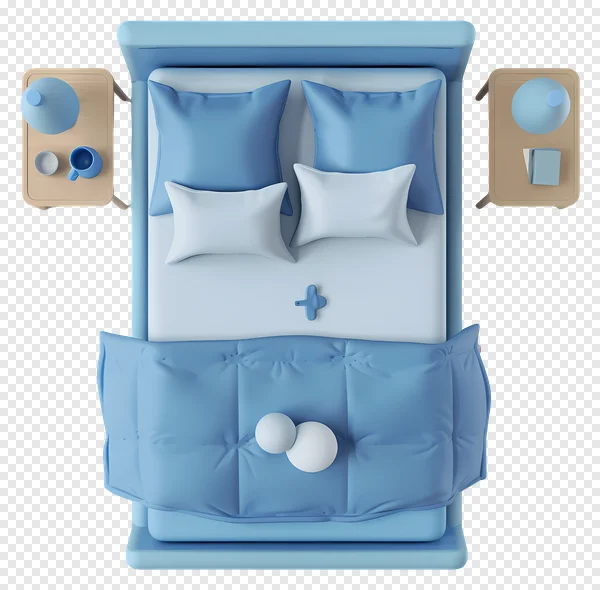 Download this stunning high-resolution PNG image of a meticulously designed 3D rendered bed. Perfect for presentations, websites, or any project needing a clean and modern bedroom aesthetic. The image features a light blue bed with matching bedding, pillows, and nightstands, all rendered in a smooth, cartoonish style. The overhead view showcases the complete bed setup, including details like a small airplane toy and decorative elements on the nightstands. Download now for free and enhance your design projects!