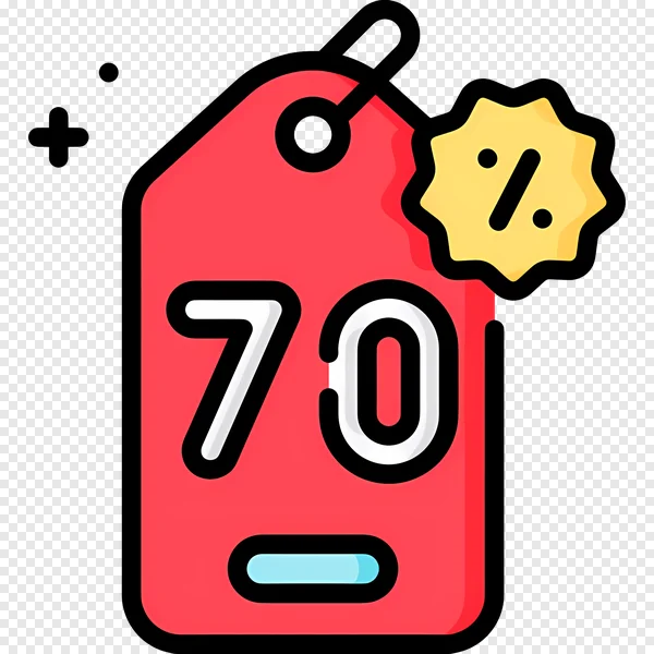 Download this vibrant and eye-catching 70% off discount price tag PNG icon for free! Perfect for announcing huge sales, special promotions, and irresistible deals. This high-quality vector graphic features bold '70' text in white with a black outline, a prominent red tag, and a dynamic yellow percentage starburst, making it ideal for e-commerce websites, marketing materials, social media posts, and advertising banners. Get your audience excited about your 70 percent discount today with this transparent PNG, ready for instant use in any project! Boost your campaigns with this free, professional asset.