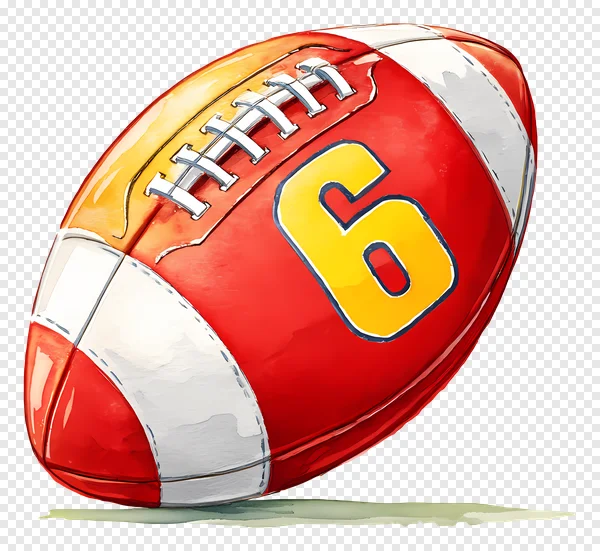 Download this high-quality, free American Football PNG image featuring a vibrant red and white ball with a prominent yellow number '6'. This unique illustration-style graphic, complete with white laces, is perfect for sports-themed designs, school projects, team graphics, jersey number displays, or game day promotions. The transparent background ensures easy integration into any creative endeavor, from digital art to print materials. Enhance your projects with this eye-catching football with the number six – get your free transparent PNG today!