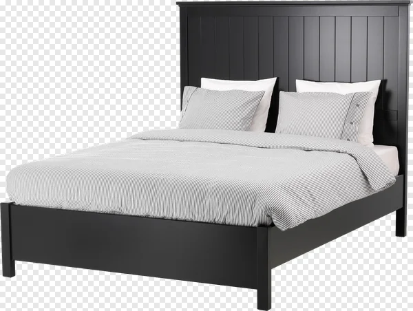 Download this high-quality PNG image of a black bed with striped bedding. Perfect for website mockups, interior design projects, or any project needing a realistic bed illustration. This transparent background image is easily integrated into your designs. Download now and enhance your visuals!