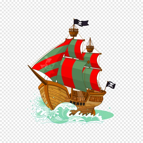 Embark on a high-seas adventure with our free cartoon pirate ship PNG image! This vibrant illustration features a classic wooden vessel with striking red and green striped sails, adorned with the iconic skull and crossbones (Jolly Roger) emblem. Watch it cut through dynamic turquoise waves, perfect for adding a touch of swashbuckling fun to your designs. Ideal for kids' projects, game assets, website banners, educational materials, or personal creative ventures. Download this high-quality, transparent PNG for instant use in your graphic design, digital art, or print projects. Arrr you ready to sail? Get your free pirate ship graphic today!