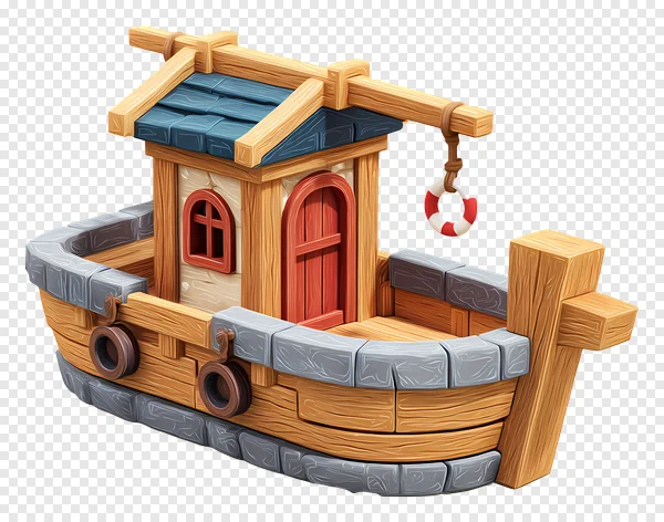 Dive into creativity with this charming free cartoon wooden boat PNG, perfect for game developers, graphic designers, and educators. This high-quality nautical clip art features a whimsical vessel with a cozy blue-tiled cabin, a distinctive red door, an arched window, and a playful red and white lifebuoy. Its vibrant, illustrative style makes it ideal as a game asset, UI element, children's book illustration, or for engaging craft projects. Download this unique ship icon with a transparent background instantly for your next digital or print design and add a touch of maritime adventure!