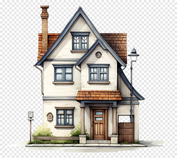 Download our delightful cartoon house PNG for free! This charming two-story home illustration features a warm tiled roof, a classic brick chimney, multiple windows with blue frames, and a welcoming wooden front door. Complete with a cozy front yard, a small bench, a traditional street lamp, and a mailbox, this transparent PNG is perfect for graphic design, web projects, children's books, game development, or adding a touch of whimsy to any creative endeavor. Get this high-quality, detailed architectural drawing instantly with no attribution required. Enhance your designs with this idyllic suburban house today!