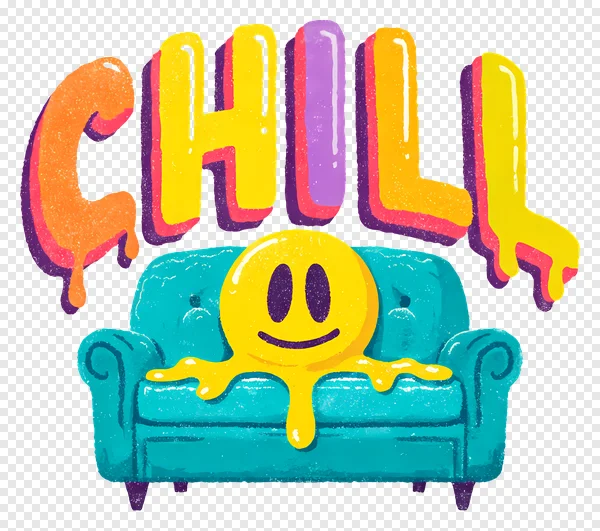 Get your free "CHILL" PNG image! This vibrant, retro-style illustration features a melting yellow smiley face character relaxing on a plush turquoise tufted sofa, with bold, colorful, dripping "CHILL" typography floating above. The artistic grain texture adds a unique touch. Perfect for adding a relaxed, happy, and groovy vibe to your creative projects. Ideal for social media graphics, blog post headers, t-shirt designs, digital art, or personal use. The transparent background ensures seamless integration into any design. Download this unique, high-quality cartoon graphic now and effortlessly spread some laid-back happiness!