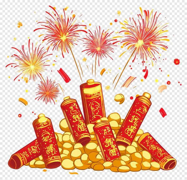 Ignite your designs with our vibrant Free Chinese New Year Fireworks & Gold Prosperity PNG! This eye-catching illustration captures the essence of Lunar New Year celebrations, featuring brilliant red and yellow fireworks bursting in the night sky. Below, a festive arrangement of traditional red firecrackers adorned with auspicious golden Chinese characters rests atop a shimmering pile of gold ingots (yuanbao), symbolizing wealth and good fortune. Perfect for digital cards, social media posts, website banners, or educational materials, this transparent PNG adds an authentic touch of Asian culture and festivity. Download this high-quality graphic for free and spread the joy and prosperity of the Spring Festival across all your creative projects!
