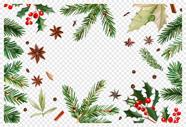 Add a touch of natural holiday cheer to your projects with this exquisite free Christmas festive border PNG. Featuring richly detailed watercolor-style illustrations of lush green fir branches, vibrant red holly berries with glossy leaves, aromatic star anise, and warm cinnamon sticks, this transparent image is perfect for creating stunning winter-themed designs. Use it for festive greeting cards, party invitations, social media graphics, website banners, digital scrapbooking, or any holiday decoration. Download this high-quality, free PNG now to frame your seasonal content beautifully and spread holiday joy!