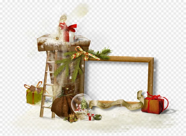 Download this enchanting free transparent PNG image, perfect for adding a festive touch to your holiday projects! This detailed graphic features a cozy brick chimney, a rustic ladder, assorted beautifully wrapped gifts, a full burlap Santa's sack, and a charming snow globe depicting Santa Claus and a Christmas tree. Delicate snowflakes drift around a prominent wooden frame, ready for your personalized photo or message. A 'Christmas is Here' banner completes the scene. Ideal for digital scrapbooking, greeting cards, invitations, social media graphics, or any winter holiday design. Get your high-quality, transparent Christmas scene PNG today and create magical memories!