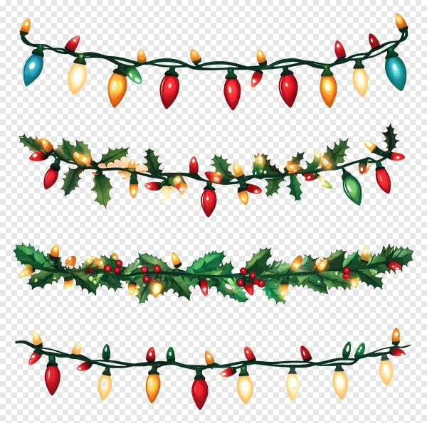 Brighten up your seasonal projects with this stunning collection of free Christmas lights and festive holly garland PNG images. This versatile pack features four unique, high-quality designs on a transparent background, perfect for effortless integration into any digital or print media. You'll find classic multi-colored string lights in various styles, alongside lush green holly foliage adorned with bright red berries and warm glowing bulbs. Ideal for holiday cards, social media graphics, website banners, party invitations, DIY crafts, or any creative endeavor needing a touch of cheer. Download these vibrant, SEO-friendly holiday decorations instantly and add a festive sparkle to your designs!