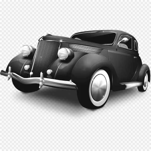 Download this iconic free PNG of a classic vintage car, rendered in a sleek black and white (grayscale) style. This high-quality illustration features a prominent chrome grille, large round headlights, a stylish front bumper, and distinctive whitewall tires with metallic hubcaps, evoking the elegance of 1930s-1940s automobiles. Perfect for graphic designers, web developers, and enthusiasts, this transparent background image is ideal for adding a touch of retro charm to websites, presentations, posters, or any creative project. Get your free old car PNG download instantly!