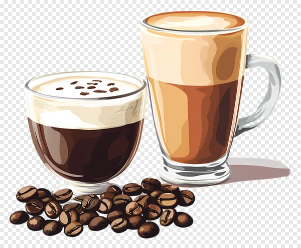 Download this beautiful, high-resolution coffee PNG image for free! Featuring a delicious latte in a tall glass and a classic espresso in a cup, alongside a scattering of roasted coffee beans. Perfect for websites, graphic design projects, social media, and more. Enhance your coffee-themed designs with this transparent background image. Get your free download now!