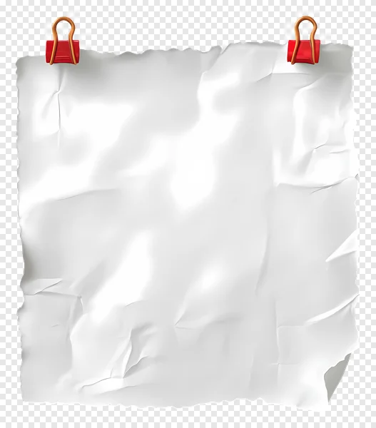 Download this high-resolution crumpled paper PNG image for free! Perfect for adding a realistic, textured effect to your designs. Featuring two red binder clips, this blank paper texture is ideal for notes, memos, posters, backgrounds, and more. Use it to create a distressed or vintage look in your projects. Transparent background for easy integration. Get your free download now!