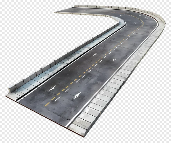 Download this high-quality free PNG image featuring a sharp, isolated curved asphalt road segment, perfect for graphic design, game development, and transportation-themed projects. This detailed illustration boasts dark grey asphalt with distinct yellow dashed center lines, crisp solid white edge lines, and clear white directional arrows, all neatly framed by concrete barriers or curbs. Its transparent background allows for seamless integration into any visual composition, from overlaying on maps to creating intricate virtual road networks. Enhance your presentations, infographics, or digital art with this versatile and professional road asset. Get your free curved road PNG download now!