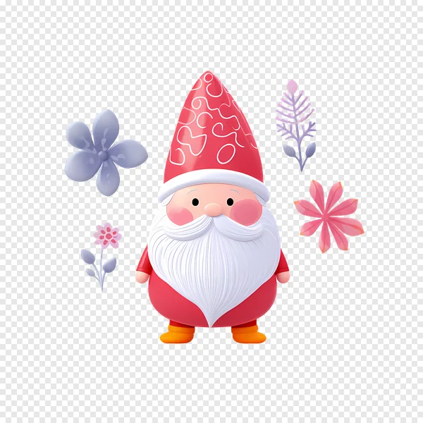 Discover this charming and free 3D rendered gnome PNG, perfect for adding a touch of whimsy to your projects! Featuring a delightful gnome with a vibrant red patterned hat, a fluffy white beard, rosy cheeks, and bright orange boots. This lovable character is surrounded by beautifully stylized spring elements, including a large periwinkle-toned flower, a delicate pink bloom with a stem, and a graceful lavender-like plant. Ideal for spring-themed designs, garden graphics, digital scrapbooking, invitations, children's book illustrations, or any creative work needing a cute fantasy touch. Download this high-quality, transparent PNG for free and let your imagination bloom!