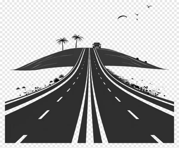 Embark on a visual journey with our free Dark Night Highway Drive PNG. This minimalist vector illustration features a lone car driving up a winding desert road, flanked by iconic palm trees under a subtle moonlit sky. The striking black and white aesthetic creates a sense of peaceful solitude and endless adventure. Perfect for web backgrounds, graphic design projects, presentations, or any creative endeavor needing a sleek, modern, and high-quality travel-themed image. Download this royalty-free PNG today to add a touch of mysterious elegance to your next design!