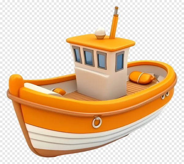 Discover this charming, stylized orange fishing boat PNG image, available for free download! This high-quality 3D rendered graphic features a vibrant orange hull with white accents, a detailed cabin with windows, a wooden deck, and nautical elements like a buoy and oars. Perfect for adding a fun, maritime touch to your websites, presentations, educational materials, children's books, or any creative design project. Its transparent background ensures seamless integration into any layout. Download this adorable fishing vessel clipart today and bring a splash of sea-faring adventure to your next project!