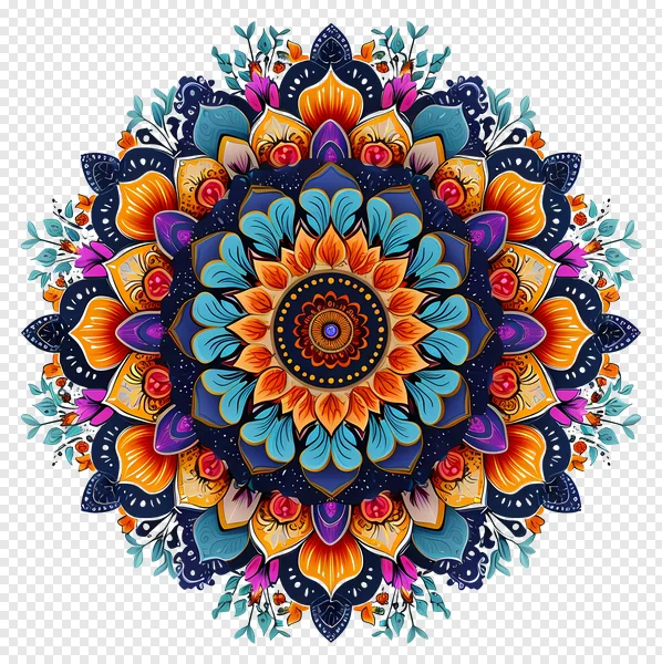 Discover this breathtaking free PNG download featuring a vibrant floral mandala. This ornate and intricate design boasts a stunning array of rich colors including brilliant orange, deep blue, striking purple, and magenta, all beautifully contrasted against a solid black background. Perfect for adding a touch of spiritual elegance or bohemian flair to your projects. Use this high-resolution transparent image for graphic design, website backgrounds, digital art, meditation apps, textile patterns, or unique creative endeavors. Download now and infuse your designs with this mesmerizing, symmetrical artwork!