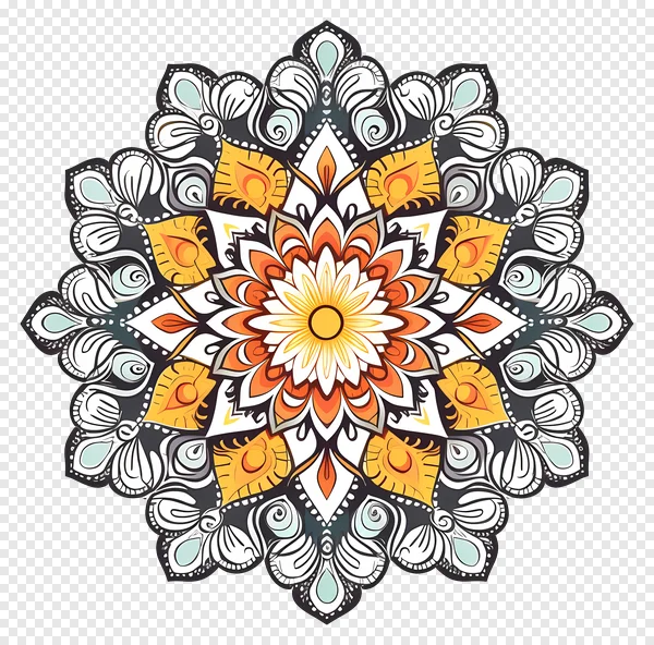 Discover and download this captivating free mandala PNG image, showcasing an exquisitely detailed floral pattern in brilliant orange, warm yellow, and crisp white, set against a deep black backdrop. Its elegant and spiritual aesthetic makes it ideal for a variety of uses, from enhancing your personal meditation space to enriching professional design projects. This high-quality, transparent graphic is perfect for digital scrapbooking, website banners, social media posts, or as unique printable art. Get your free mandala download now and infuse your creations with serene beauty and intricate charm.