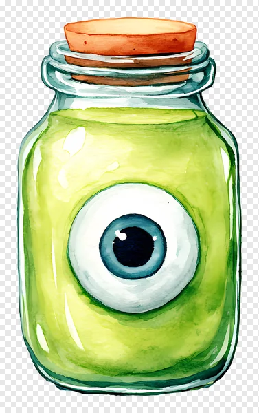 Dive into the eerie charm of this free Eyeball in Jar PNG! This unique watercolor illustration features a creepy blue eyeball suspended in glowing green liquid within a corked glass jar, set against a transparent background. Perfect for adding a spooky, magical, or whimsical touch to your Halloween projects, fantasy art, party invitations, social media graphics, or game design. The hand-painted style offers a distinct artistic flair. Download this high-quality, transparent PNG now to conjure up some frightful fun and make your designs stand out!