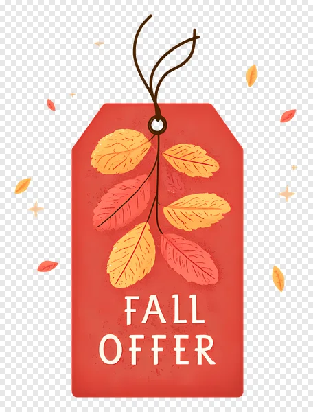 Download this beautiful, high-quality Fall Offer PNG image for free! Perfect for autumn sales, seasonal promotions, or adding a festive touch to your designs. Featuring a vibrant red tag adorned with illustrated fall leaves, this transparent background PNG is ideal for graphic design projects, website banners, social media posts, and more. Enhance your fall marketing with this free, versatile graphic. Get your free download now!