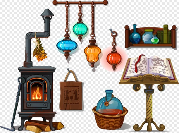 Tags: PNG alchemy digital art enchanted fantasy fireplace free download game assets grimoire hanging herbs magic medieval mystical lanterns potion bottles spellbook transparent background vintage witchcraft wizardry wood stove