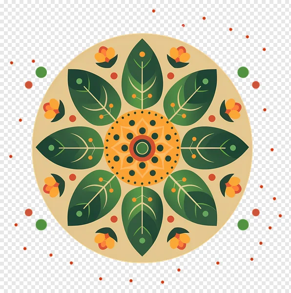 Download this captivating floral mandala PNG for free! This vibrant vector-style illustration features a symmetrical circular design with lush dark green leaves radiating around a central orange floral motif. Charming smaller orange blooms and scattered red and green dots adorn the sleek black background, creating a visually striking pattern. Perfect for enhancing digital art projects, web design, invitations, backgrounds, or any creative endeavor. Get your high-quality, transparent PNG today and add a touch of natural elegance to your designs!