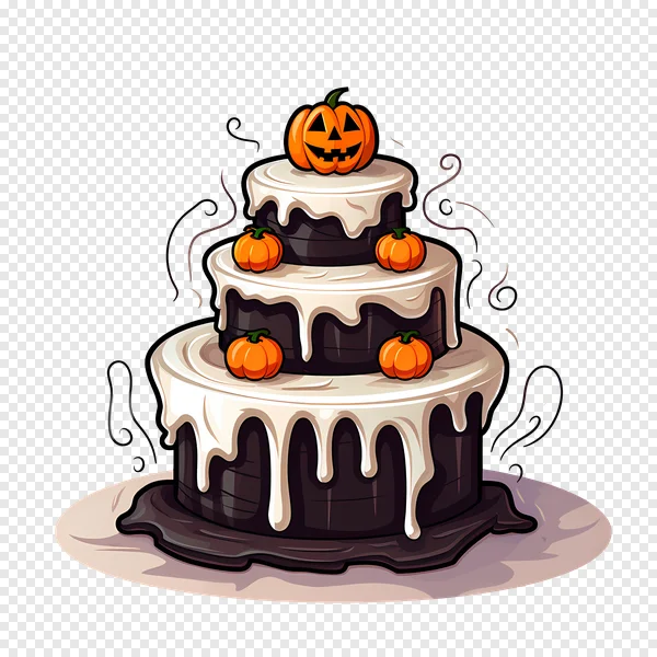 Download this delightful and spooky Halloween cake PNG for free! This captivating three-tiered chocolate cake illustration features rich, dark layers topped with elegant white dripping frosting. A prominent, cheerful jack-o'-lantern serves as the festive topper, complemented by smaller, adorable pumpkins decorating each tier. Perfect for adding a sweet, eerie touch to your Halloween party invitations, social media graphics, website banners, craft projects, or digital designs. With its transparent background, this high-quality vector-style PNG seamlessly integrates into any creative work. Get this unique Halloween dessert graphic today and make your designs pop!