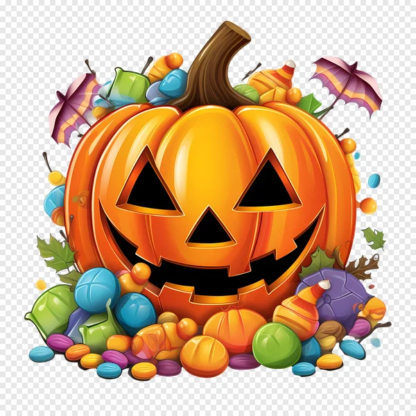 Download this vibrant, free Halloween Jack-o'-lantern PNG, bursting with an array of colorful, glossy candies and festive autumn leaves, all set on a transparent background. This charming illustration features a classic carved pumpkin with a friendly, spooky smile, making it perfect for all your trick-or-treat themed designs, party invitations, digital art, or seasonal marketing materials. Its high-quality details and versatile nature ensure it will add a sweet, festive touch to any project. Get your free Halloween graphic today and bring your spooky season ideas to life!