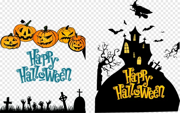 Download this fantastic free Halloween PNG image featuring a collection of classic spooky elements! Perfect for your Halloween projects, this high-quality graphic includes grinning jack-o'-lanterns, a haunted house silhouette, a flying witch, zombies, tombstones, and bats. Use it for invitations, social media graphics, website designs, or any other creative endeavor. Get your free download now and add a touch of Halloween magic to your work!