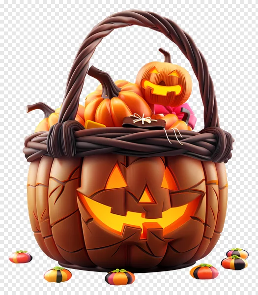 Download this captivating Halloween Pumpkin Basket PNG for free and bring a delightful spooky charm to your projects! This high-quality 3D render showcases a beautifully crafted pumpkin-shaped basket with an illuminated jack-o'-lantern face carved into its base, radiating a warm, inviting glow. The intricately woven handle adds a rustic touch, while the basket itself is filled to the brim with vibrant orange mini pumpkins, one of which is also a cheerful jack-o'-lantern, alongside other festive goodies like a witch's hat and colorful candy-like pieces. Set against a deep black background, the rich autumnal colors truly pop. Ideal for creating eye-catching Halloween invitations, social media graphics, website banners, party decorations, or any creative design needing a touch of holiday spirit. Enhance your trick-or-treat promotions or autumn event flyers with this charming and festive image. Available for instant, free download!
