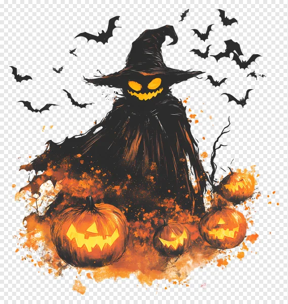 Dive into the spooky spirit of Halloween with this captivating free PNG image! Featuring an eerie scarecrow-like figure with a witch's hat, glowing orange eyes, and a jagged smile, surrounded by flying bats and illuminated jack-o'-lanterns. The vibrant orange and black digital art, accented with grunge splatters, creates a truly haunting atmosphere perfect for your holiday projects. Ideal for Halloween party invitations, social media graphics, website banners, crafts, or digital scrapbooking. Download this high-quality, transparent background illustration instantly and add a touch of mysterious charm to your designs. Get ready to enchant your audience this Halloween season!