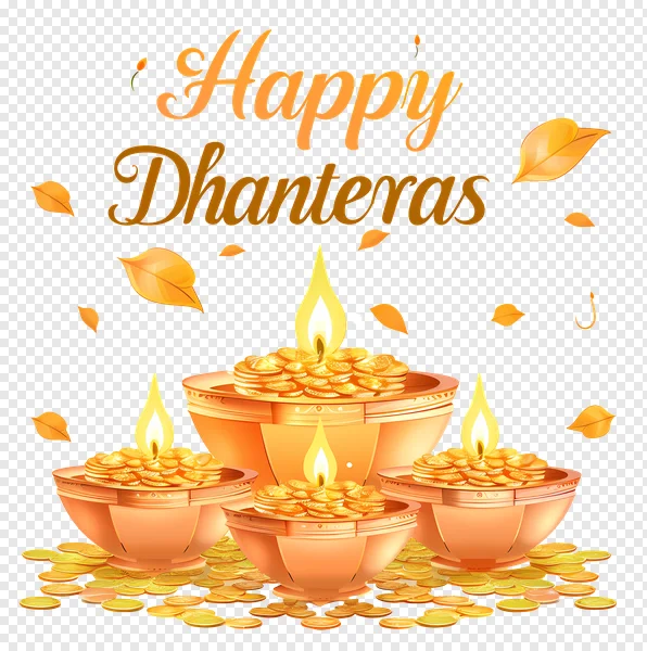 Celebrate the auspicious festival of Dhanteras with this vibrant, high-quality PNG image. Featuring elegant "Happy Dhanteras" typography, traditional golden diyas overflowing with shimmering gold coins, and delicate falling leaves on a transparent background, this graphic perfectly captures the spirit of wealth and prosperity. Ideal for crafting festive greetings, captivating social media posts, e-cards, banners, and digital designs. Download this stunning Dhanteras PNG for free to add a touch of golden sparkle to your Diwali celebrations and share wishes of abundance and good fortune with friends and family. Enhance your festive projects effortlessly with this radiant design!