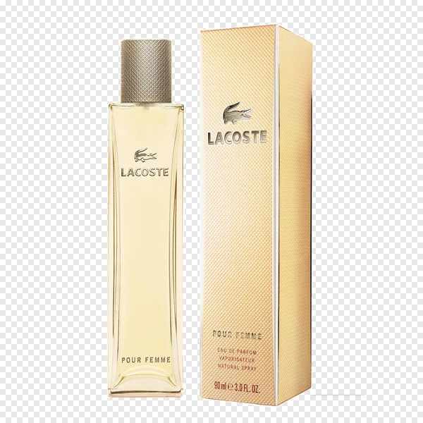 Download a stunning, high-quality PNG image of Lacoste Pour Femme Eau de Parfum, featuring the elegant clear glass bottle with its signature gold cap and the sophisticated textured golden box. This transparent, free-to-download product shot is perfect for e-commerce, beauty blogs, marketing materials, graphic design projects, or any content requiring a premium women's fragrance visual. Enhance your digital presence with this iconic Lacoste perfume bottle and packaging. Get your free transparent PNG today!