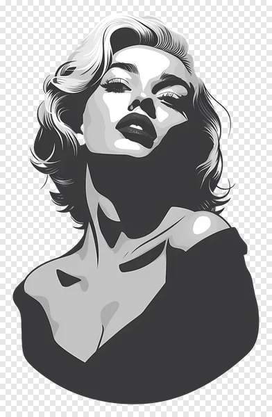 Capture timeless elegance with this free downloadable PNG of a glamorous woman. This stunning black and white vector illustration, reminiscent of classic Hollywood icons like Marilyn Monroe, features intricate shading, soft waves in her hair, and a captivating expression. Perfect for graphic design projects, website backgrounds, social media posts, or adding a touch of vintage chic to any creative endeavor. Its high-contrast, pop art aesthetic makes it a versatile asset. Download this beautiful, high-quality greyscale portrait transparent PNG today and elevate your designs!