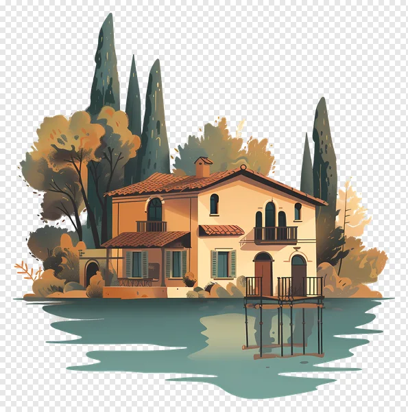 Immerse yourself in tranquil beauty with this free downloadable PNG of a charming Mediterranean waterfront villa. This stylized illustration features a picturesque house with terracotta roofs, sun-drenched walls, and a quaint pier overlooking serene waters. Tall cypress trees and warm-toned foliage frame the scene, evoking a peaceful European lakeside or canal-side setting. Perfect for graphic design, web projects, travel blogs, digital art, or adding a touch of rustic elegance to any creative work. Get this high-quality, transparent background image today!