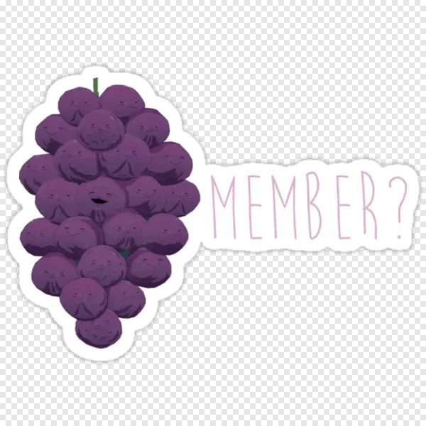 Relive the iconic South Park moments with our free Member Berries Grape sticker PNG! This hilarious and instantly recognizable meme features a bunch of cheerful (and slightly sinister) purple grapes, each with a unique face, accompanied by the classic 'MEMBER?' text in a playful font. Perfect for adding a touch of humor and nostalgia to your digital projects, social media posts, presentations, custom merchandise, or even as a unique reaction image. Download this high-quality, transparent cartoon fruit character image for free today and share the laughs!