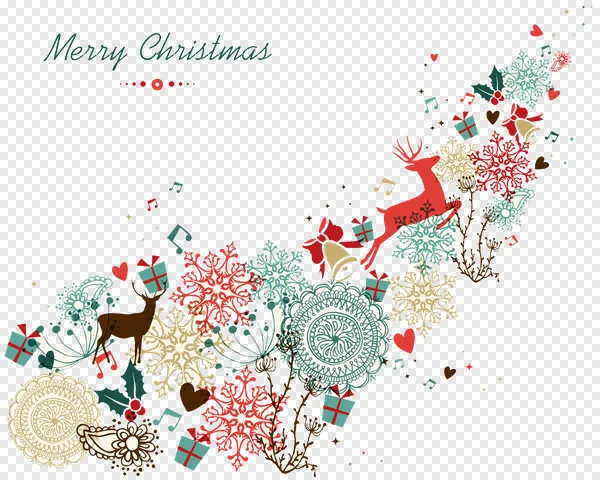 Download this beautiful Free Merry Christmas Reindeer & Snowflake Border PNG. Featuring elegant jumping reindeer, intricate snowflakes in red, teal, and gold, festive bells, holly, gift boxes, and musical notes, this whimsical holiday illustration is perfect for greeting cards, invitations, social media, or any festive project. Its vintage-inspired design adds a charming touch. Get your high-quality transparent Christmas graphic for free now!