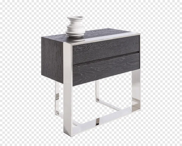 Elevate your design projects with this free, high-quality PNG of a chic modern nightstand. Featuring a rich dark wood finish, possibly black oak or wenge, complemented by sleek chrome or polished steel legs and frame, this side table offers contemporary elegance. It includes two practical drawers for storage and is topped with a subtle white decorative vase. Perfect for interior design mockups, e-commerce product displays, architectural visualizations, or enhancing any digital graphic. Download this stylish furniture piece with a transparent background for seamless integration into your creative work today!