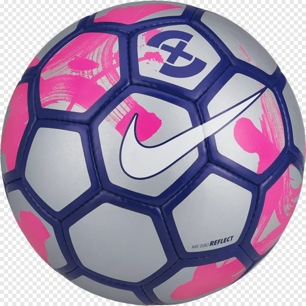Download this striking Nike soccer ball PNG for free! Featuring a modern design with silver, vibrant pink brushstroke accents, and deep blue hexagonal panels, this high-resolution football image is perfect for your sports-themed projects. The iconic Nike swoosh and 'DURO REFLECT' branding are clearly visible, making it ideal for web design, presentations, or digital art. Get this athletic equipment graphic with a transparent background instantly for your creative needs. Free for personal and commercial use.