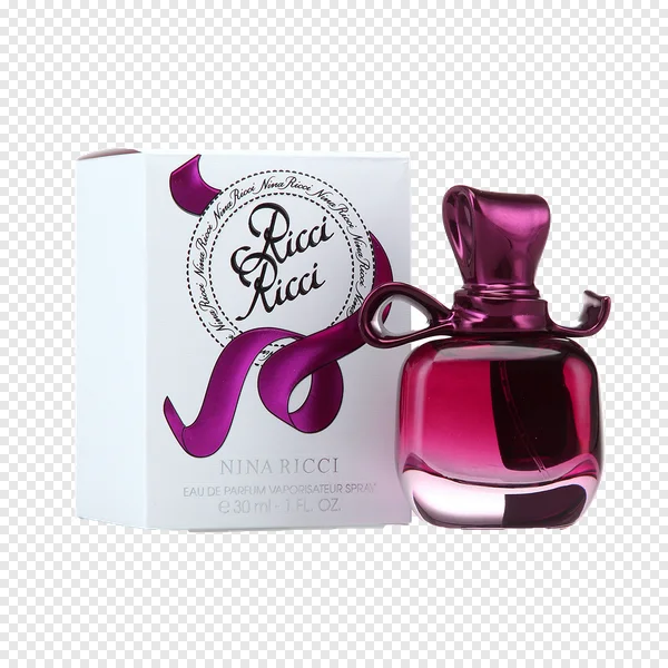 Download this exquisite Nina Ricci Ricci Ricci Eau de Parfum PNG image for free. Featuring a stunning magenta perfume bottle with its signature bow-shaped cap, elegantly displayed alongside its white box adorned with a matching purple ribbon design. This isolated, high-quality image is perfect for beauty blogs, e-commerce stores, graphic design projects, presentations, or adding a touch of luxury to your digital content. Get this iconic 30ml designer fragrance product shot with transparent background today for all your creative needs!