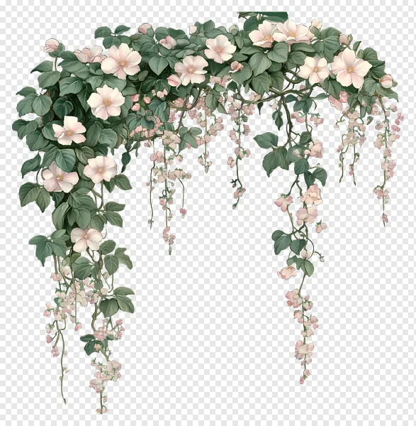 Download this stunning free PNG of elegant pink flowers and lush green leaves forming a beautiful trailing vine. Perfect for adding a touch of botanical charm to your design projects. This high-quality floral illustration features a transparent background, making it ideal for overlays, borders, invitations, greeting cards, digital scrapbooking, and web design. Enhance your creative works with this delicate and versatile blossom garland. Get your free transparent floral PNG now!
