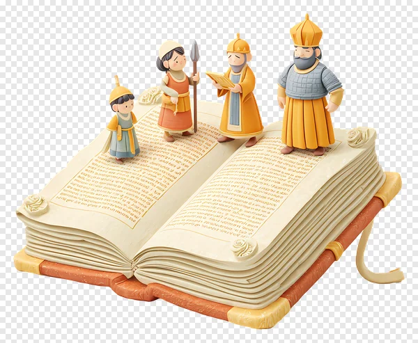 Uncover tales of old with this charming free PNG featuring four 3D rendered stylized characters standing on an open book. This unique illustration depicts a boy, a female spear-bearer, a wise man reading a scroll, and a regal warrior or king, all adorned in ancient-themed attire. The intricately detailed open book displays golden, ancient script, symbolizing knowledge, history, and epic sagas. Perfect for educational materials, storybook designs, historical presentations, or any project needing a touch of antique charm and illustrative storytelling. Download this high-quality PNG with a transparent background for free and bring your historical and literary narratives to life today!