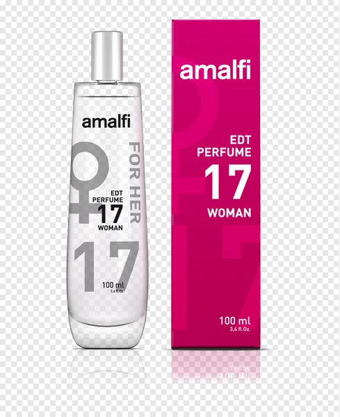 Download this high-quality, free PNG image of Amalfi '17 Woman' EDT Perfume. This elegant feminine fragrance features a sleek glass bottle with a silver cap and a vibrant magenta box, both clearly displaying 'Amalfi EDT Perfume 17 Woman 100ml'. Ideal for beauty blogs, cosmetic marketing materials, graphic design projects, or adding a touch of luxury and sophistication to your digital content. Get this transparent background image for your next creative endeavor now!