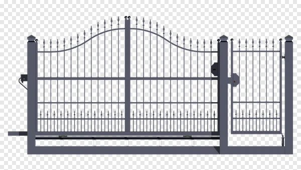 Download this high-quality, transparent PNG image of an automatic metal gate, perfect for architectural designs, landscaping projects, or any design needing a sleek, secure gate element. The detailed rendering showcases the gate's elegant arched top, decorative finials, and automated sliding mechanism. Enhance your projects with this realistic and easily integrated gate image. Download now for free!