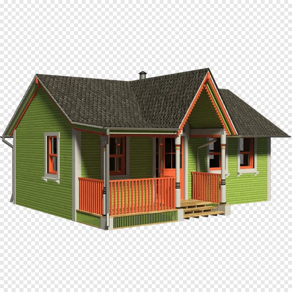 Discover this charming 3D render of a cozy small house, featuring vibrant green siding, bright orange window frames, a matching door, and a welcoming front porch with railing. This detailed architectural illustration, complete with a dark grey shingled roof and decorative gable trim, offers a picturesque and cheerful aesthetic. Perfect for design projects, presentations, or digital art, this high-quality image is ready to add a touch of colorful residential charm. Download this versatile PNG for free today and bring your creative visions to life!