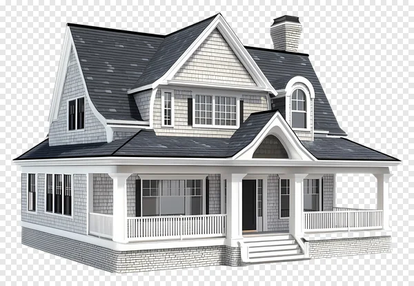 Download this stunning, high-quality PNG image of a charming 3D rendered house for free! This detailed architectural illustration features classic light grey shingle siding, a dark grey shingle roof with multiple dormer windows, a welcoming wrap-around porch with crisp white railings, and a prominent chimney. Perfect for real estate marketing, architectural presentations, home design concepts, digital art, or any project needing a stylish residential building illustration with a transparent background. Get your free download today!