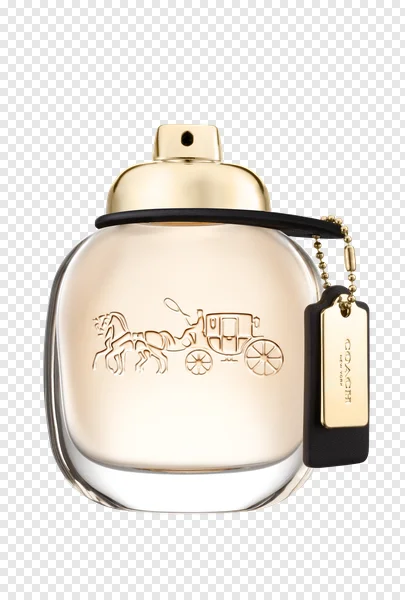 Download this elegant Coach New York perfume bottle PNG for free! This high-quality transparent image showcases the iconic fragrance in its distinctive clear glass bottle, featuring a delicate peachy-pink liquid, a luxurious gold cap, and a signature black leather-style tag with 'Coach New York' lettering on a gold plate. The beautiful embossed horse-drawn carriage logo adds a touch of classic elegance. Perfect for beauty blogs, e-commerce product mockups, graphic design projects, presentations, or any creative endeavor requiring a sophisticated perfume image. Get this transparent background PNG instantly to enhance your designs and captivate your audience.