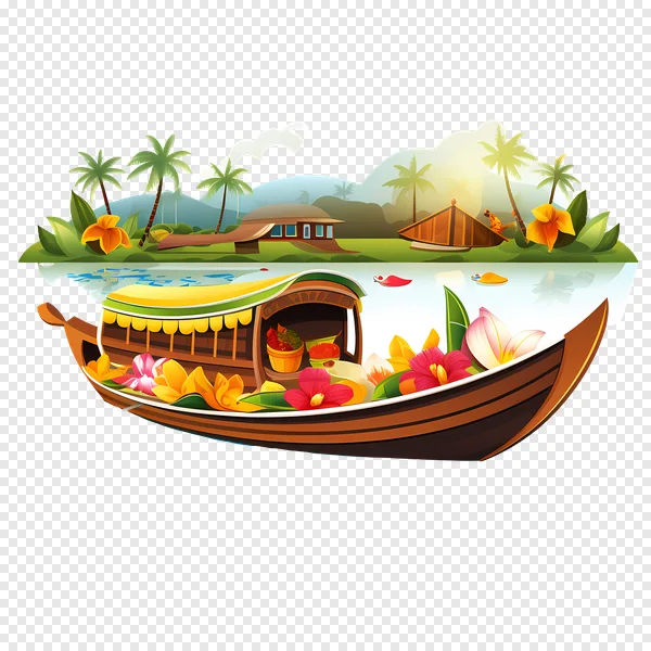 Download this stunning free PNG of a vibrant Kerala houseboat, beautifully adorned with exotic flowers, gliding on serene tropical backwaters. This detailed illustration features lush palm trees, traditional huts, and a sunny sky, perfect for adding an exotic touch to your designs, presentations, or travel-themed projects. With its transparent background, this high-quality vector-style image is ready to enhance your creative work. Get your tranquil tropical scene now!