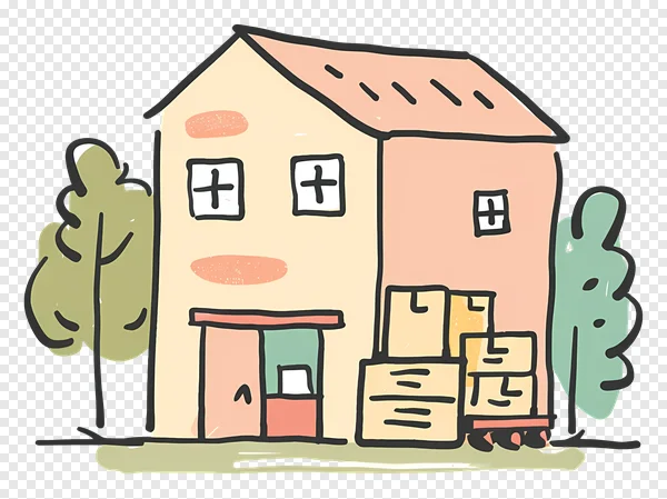 Download this adorable free PNG illustration showcasing a charming, hand-drawn house with stacked moving boxes on a small cart, flanked by whimsical trees. This high-quality graphic, featuring a soft pastel color palette and a transparent background, is perfect for projects related to home relocation, real estate, moving announcements, logistics, package delivery, or adding a cozy touch to any digital design. Ideal for websites, blogs, social media, presentations, and print materials. Capture the essence of moving day or delivery with this cute, simple, and versatile vector art. Get your free download now for personal and commercial use!