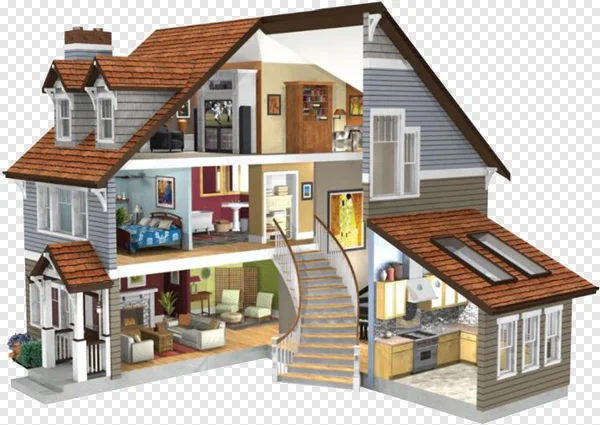 Explore the intricate details of a modern multi-story home with our free PNG image of a house cross-section. This unique cutaway view reveals beautifully designed interiors, including a cozy living room with a fireplace, a serene bedroom, a spacious kitchen with skylights, a stylish bathroom, a functional study, and a vibrant media room. Perfect for architectural projects, interior design presentations, educational materials, or simply visualizing dream homes. Download this high-quality, transparent PNG for your creative needs today and bring your concepts to life!